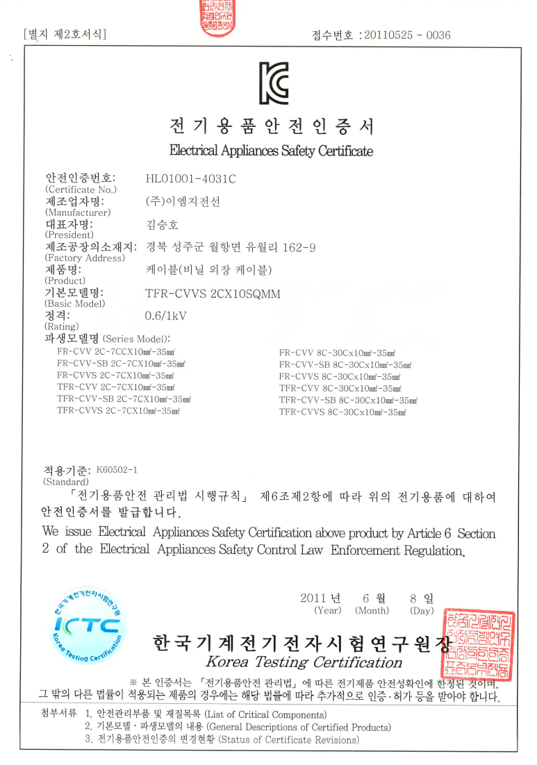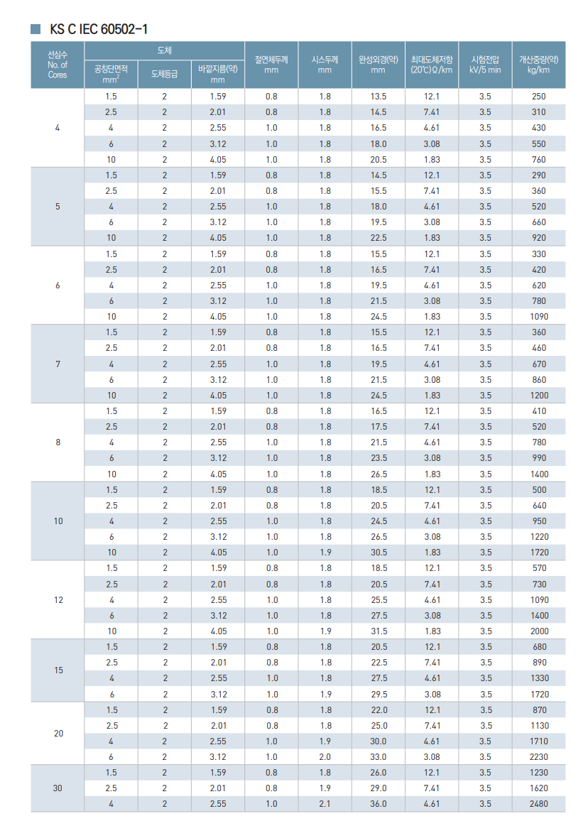 - 산업시설의 제어목적 또는 발전소, 변전소 등의 0.6/1KV 이하의 정전차폐가 요구되는 원격 제어용 및 300V 이하의 기계적 조정장비 연결용으로 적합한 케이블