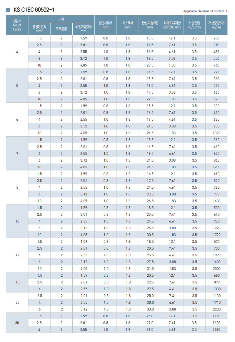 - 산업시설의 제어목적 또는 발전소, 변전소 등의 0.6/1KV 이하의 원격 제어용 및 300V 이하의 기계적 조정장비 연결용으로 적합한 케이블