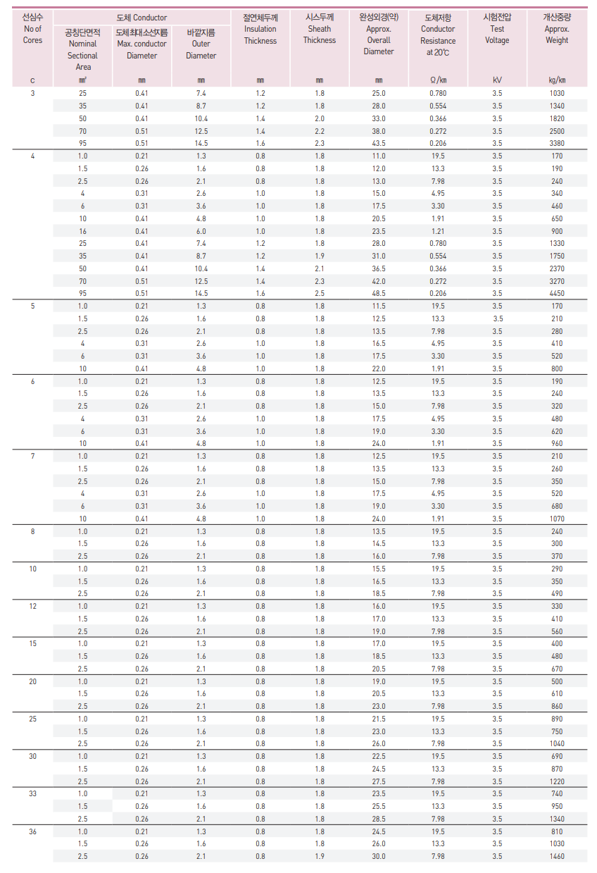 VCT 1.0SQ~2.5SQ 2가닥부터 4가닥까지는
