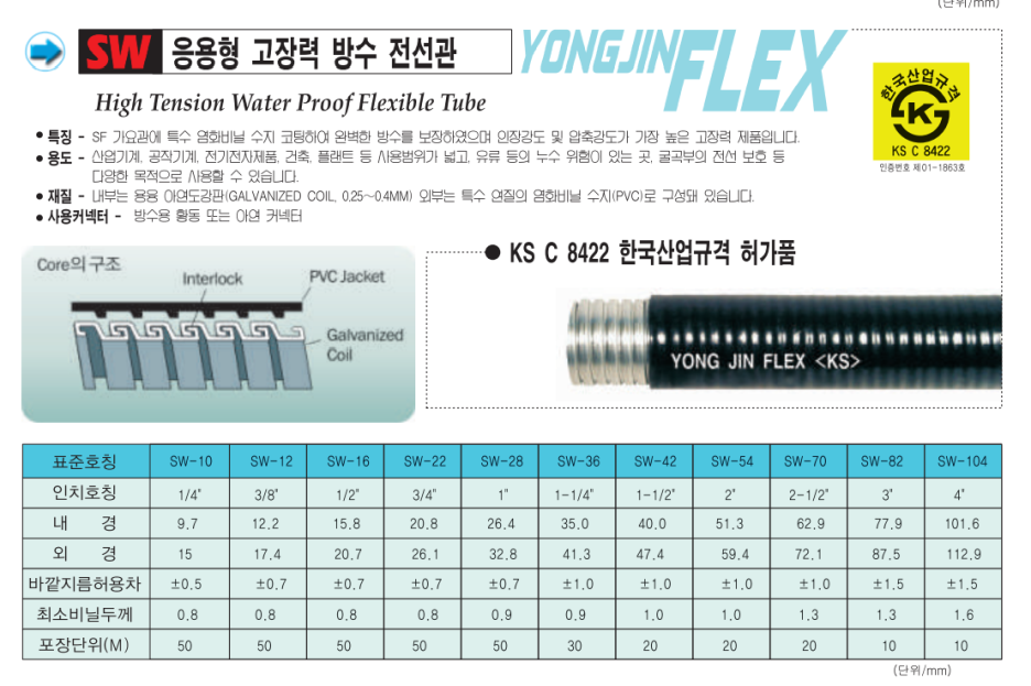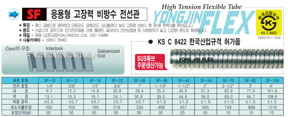 - 특징 : SF 가요관에 특수 염화비닐 수지 코팅하여 완벽한 방수를 보장하였으며 인장강도 및 압축강도가 가장 높은 고장력 제품입니다.