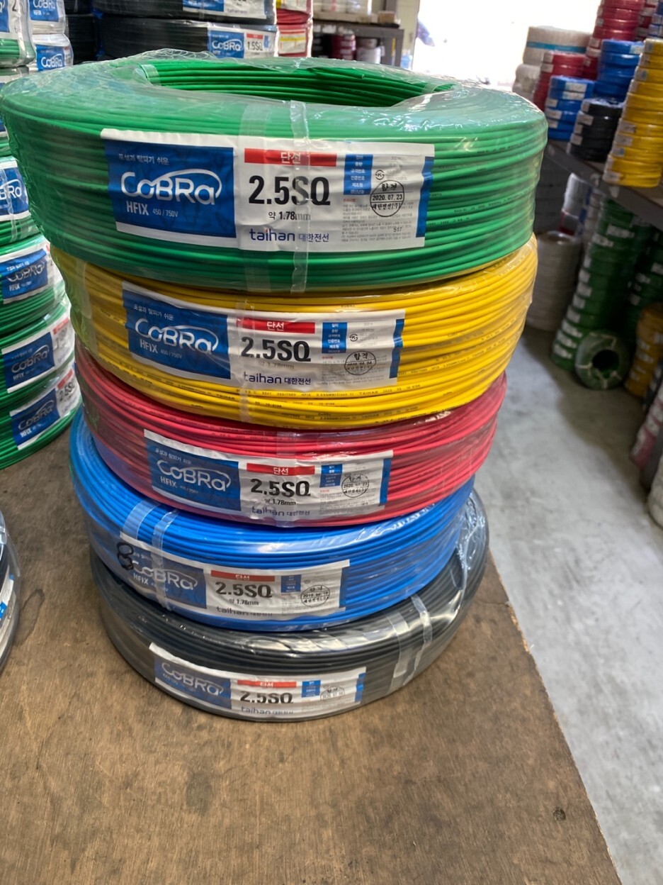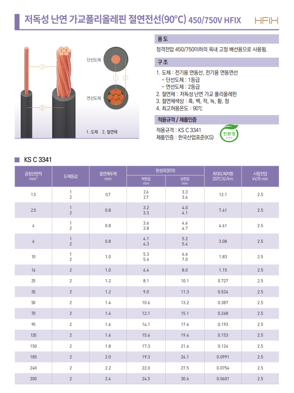 1. 450V/750V 이하의 주로 일반 전기 공작물이나 전기기기의 배선에 사용하는 저독성 난연 가교폴리올레핀으로 절연한 전선, 전기공사현장, 소방공사현장에 주로 쓰입니다.